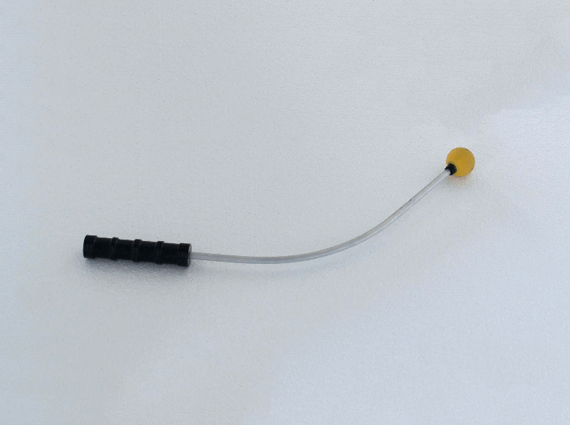 DressOn påkledningspinne har en gul friksjonskule montert i den ene ende som gjør det lett å få grep om tøyet som skal på/av.